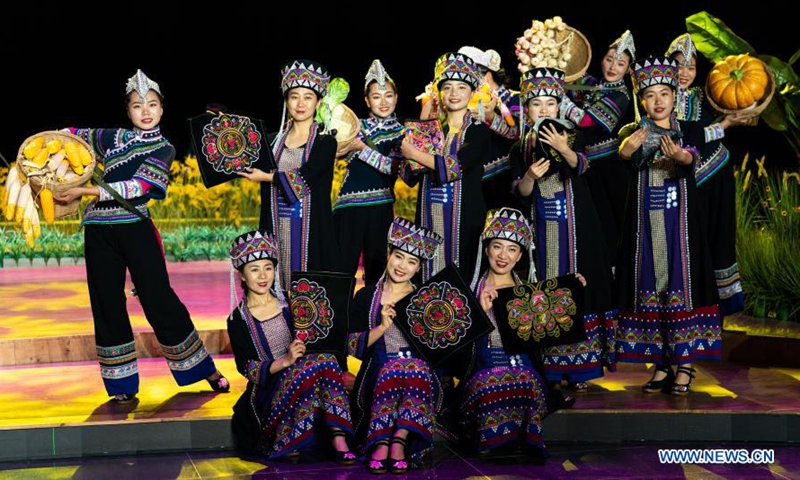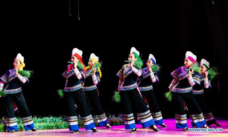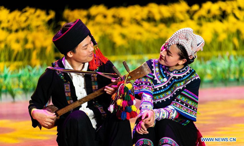 Artists of the Hani terraced fields culture inheritage center perform "The Antique Melodies of Hani" in Yuanyang County of Honghe Hani and Yi Autonomous Prefecture, southwest China's Yunnan Province, Jan. 5, 2021. "The Antique Melodies of Hani," a musical drama based on state-level intangible cultural heritage of the Hani ethnic group, is now among regular repertoire in Honghe. (Xinhua/Wang Guansen)