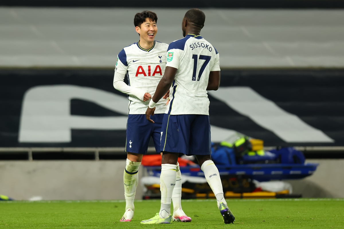 Son Heung-min (left) of Tottenham Hotspur celebrates his goal with Moussa Sissoko in their League Cup semifinal match against Brentford on Tuesday at the Tottenham Hotspur Stadium in London, England. Photo: VCG