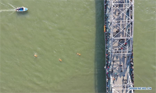 Swimmers set out during a winter swimming event in the Yellow River in Lanzhou, northwest China's Gansu Province, ...