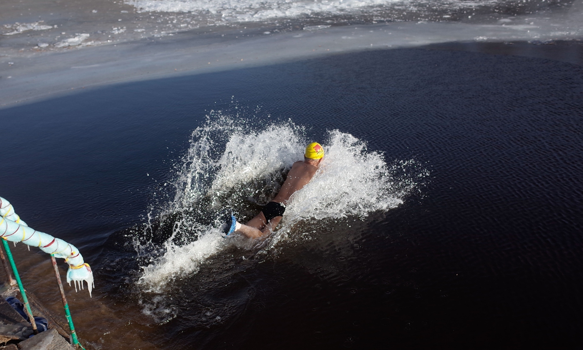 A winter swimming enthusiast jumps into a river in Shenyang, Northeast China's Liaoning Province, at temperature of -15 C, to experience the thrill of the extreme cold. Photo: IC