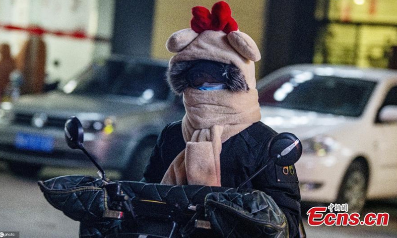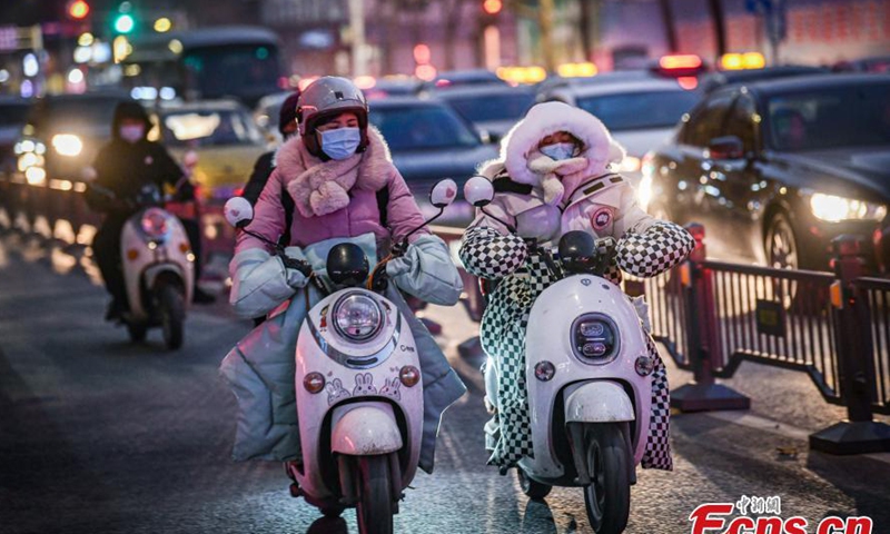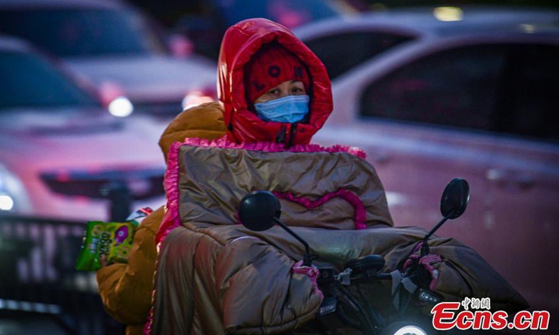 People wear thick clothes and wrap themselves up while riding to resist the cold wind in Zhengzhou city, Henan Province on Jan. 5, 2021. (Photo /IC)