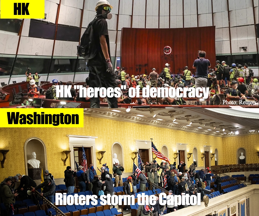 Fowdy said that there is a noticeable contrast in discourse as to how the two events are portrayed in Hong Kong and in the US. When rioters stormed the HK LegCo, it was heralded as an act of brave rebellion by "pro-democracy" protesters, but when Trump supporters stormed the US capitol building it was described by the BBC as a "violent, pro-Trump mob."