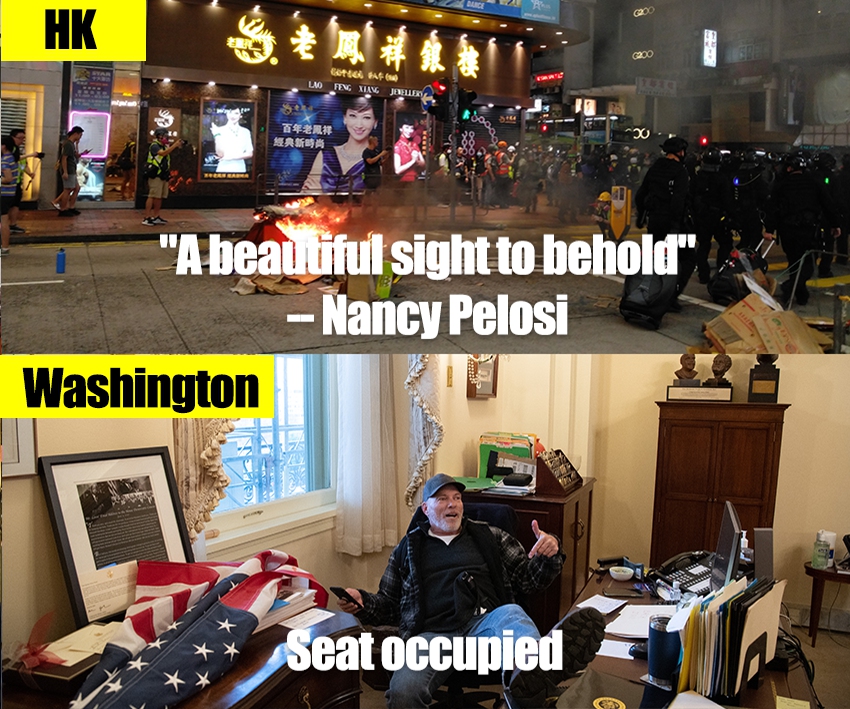 When a similar scenario happened in Hong Kong's LegCo in 2019, some US politicians like Pelosi praised rioters in the city as fighters for freedom. This has inspired some talented netizens to come up with a slogan for US mobs to continue their protests.
