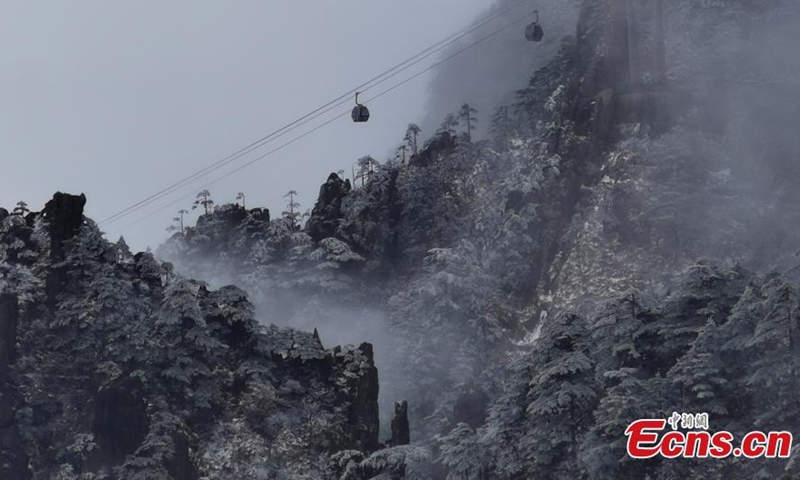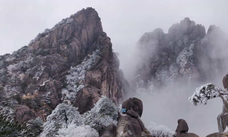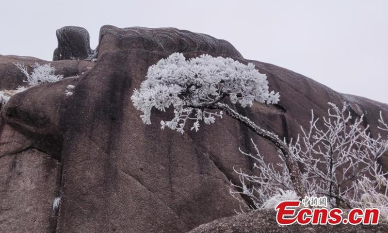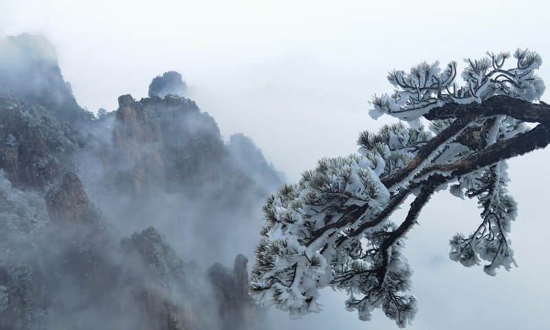 The beautiful rime scenery occurs in Mount Huang in Eastern China’s Anhui Province on Jan. 6, 2021, due to the sharply dropped temperatures caused by a new round of cold wave. The rime-covered trees and wispy clouds make Mount Huang a fairytale world. (Photo/Mei Jian)