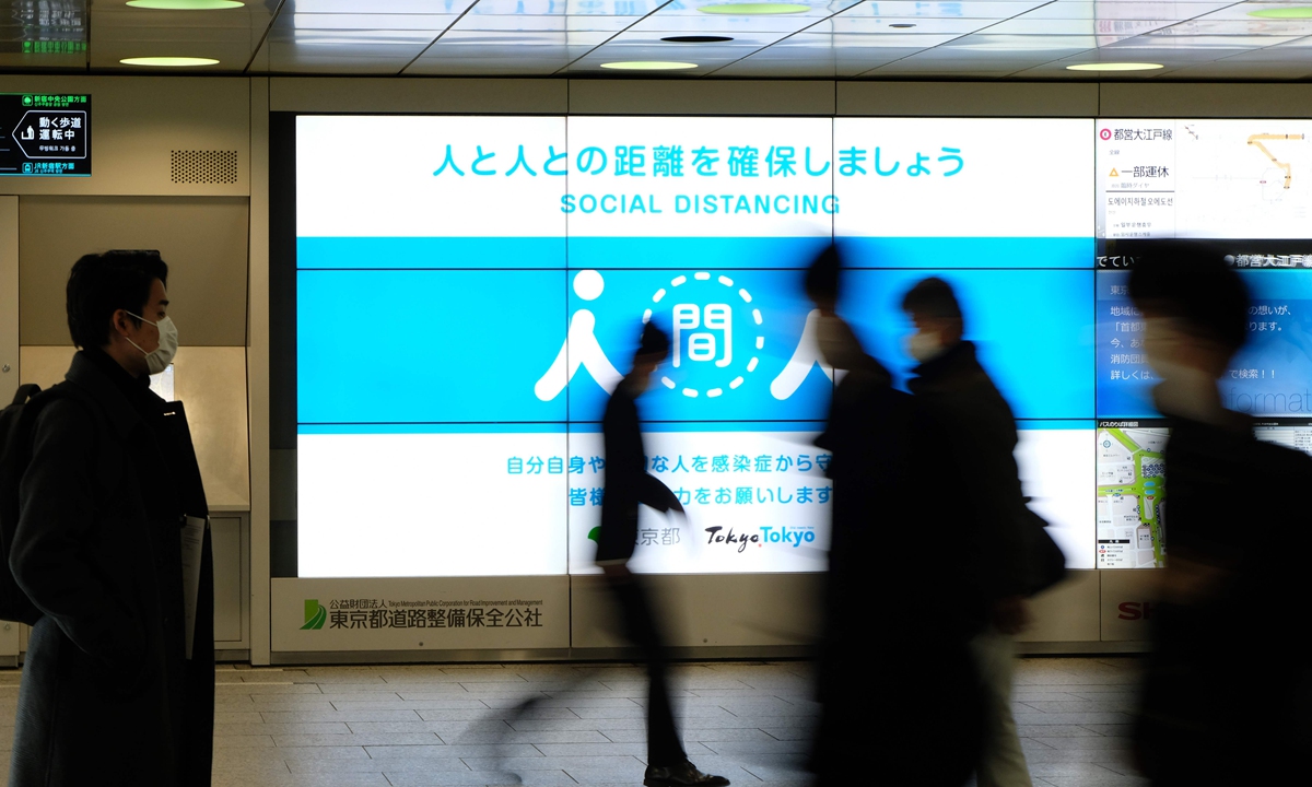 A large screen in Tokyo, Japan on Wednesday reminds of “social distancing.” Japan’s daily COVID-10 infections rose to 6,004 cases, topping 6,000 for the first time since the outbreak last year, Japanese media reported, based on official data a day ahead of an expected state of emergency declaration for the Tokyo area. Photo: VCG