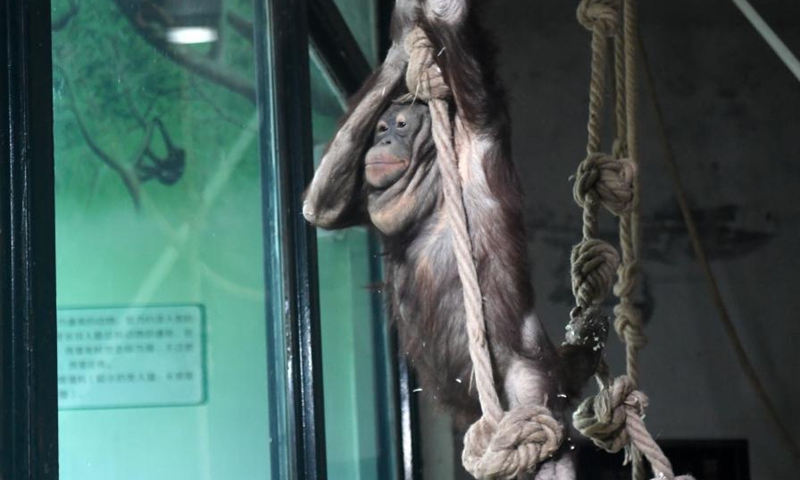 An orangutan plays at a room with floor heating at Chongqing Zoo in Chongqing, southwest China, Jan. 7, 2021.Photo:Xinhua