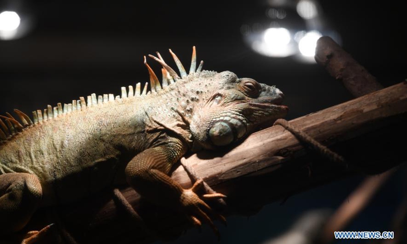 A lizard stays near heating lamps at Chongqing Zoo in Chongqing, southwest China, Jan. 7, 2021.Photo:Xinhua