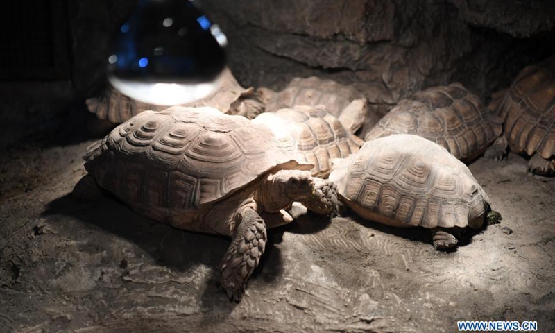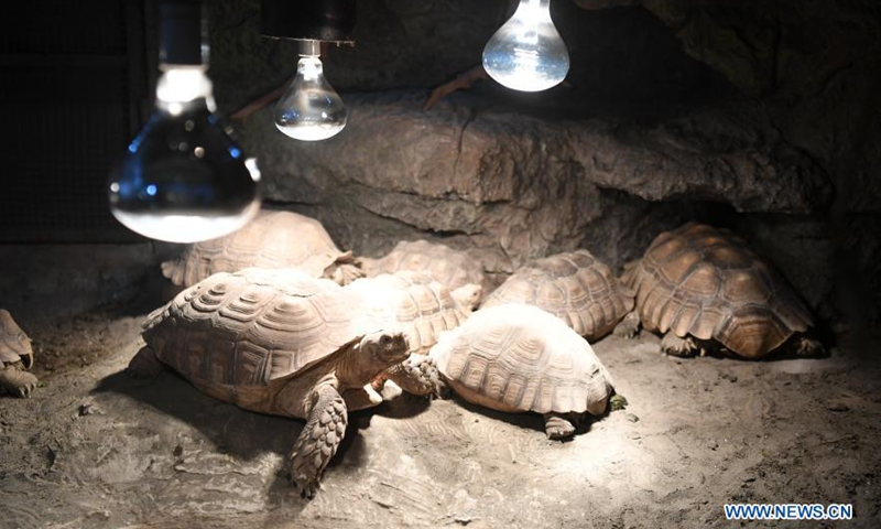 Sulcata tortoises stay under heating lamps at Chongqing Zoo in Chongqing, southwest China, Jan. 7, 2021.Photo:Xinhua