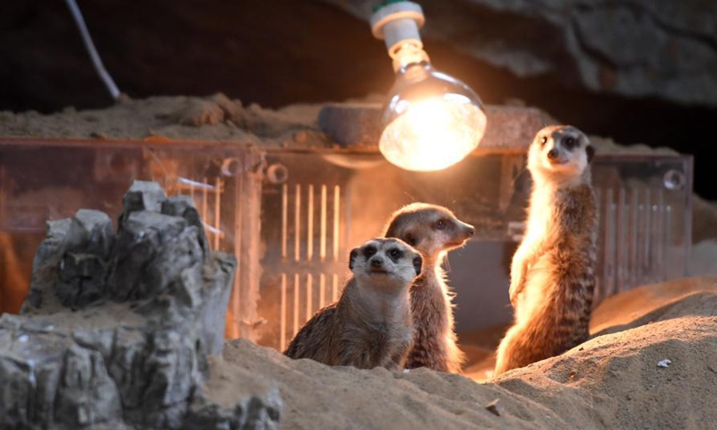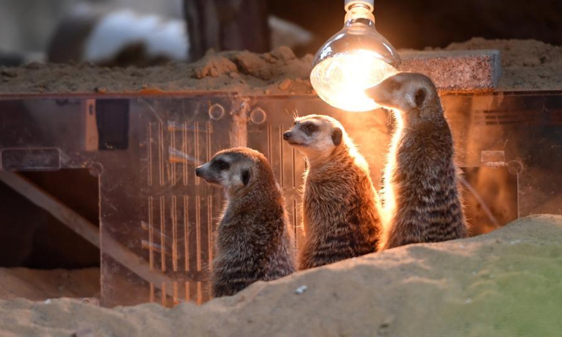 Meerkats stay under a heating lamp at Chongqing Zoo in Chongqing, southwest China, Jan. 7, 2021.Photo:Xinhua