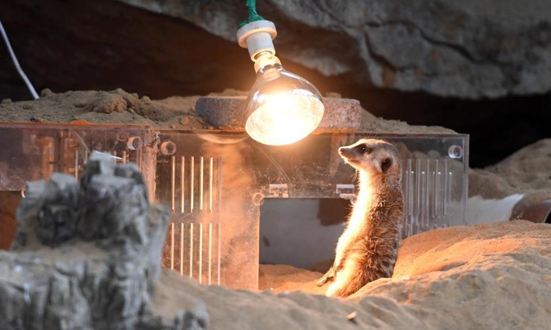 A meerkat looks at a heating lamp at Chongqing Zoo in Chongqing, southwest China, Jan. 7, 2021.Photo:Xinhua