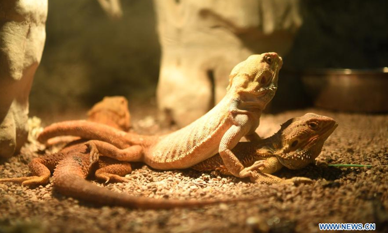 Lizards stay under heating lamps at Chongqing Zoo in Chongqing, southwest China, Jan. 7, 2021.Photo:Xinhua