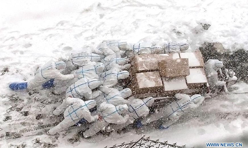 Undated photo provided by Dalian Ocean University shows members of the university's anti-epidemic volunteer team delivering supplies to students' dormitory at the university in Dalian, northeast China's Liaoning Province. Photo:Xinhua