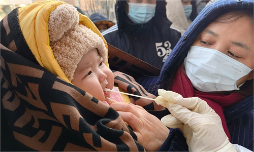 A medical worker collects a swab sample from a resident at a community in Yuhua District of Shijiazhuang, capital of north China's Hebei Province, Jan. 7, 2021. Shijiazhuang started to conduct citywide nucleic acid tests covering all residents on Wednesday. (Xinhua/Jin Haoyuan)