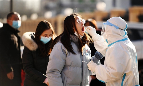 A medical worker collects a swab sample from a child at a community in Yuhua District of Shijiazhuang, capital of north China's Hebei Province, Jan. 7, 2021. Shijiazhuang started to conduct citywide nucleic acid tests covering all residents on Wednesday. Photo:Xinhua