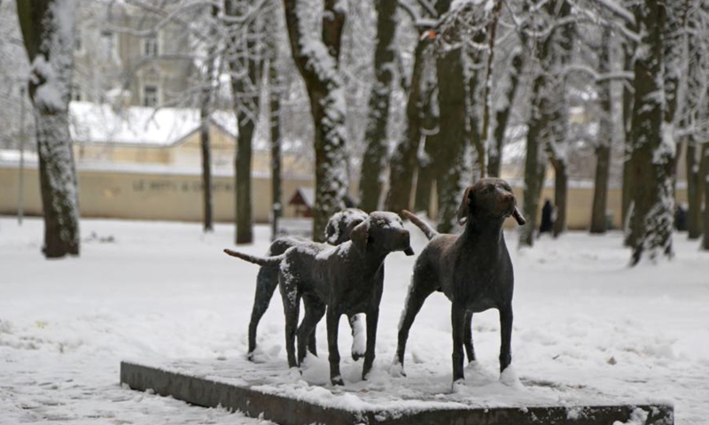 Photo taken on Jan. 8, 2021 shows the sculpture of dogs near the Cathedral Square in Vilnius, Lithuania. (Xinhua/Guo Mingfang)