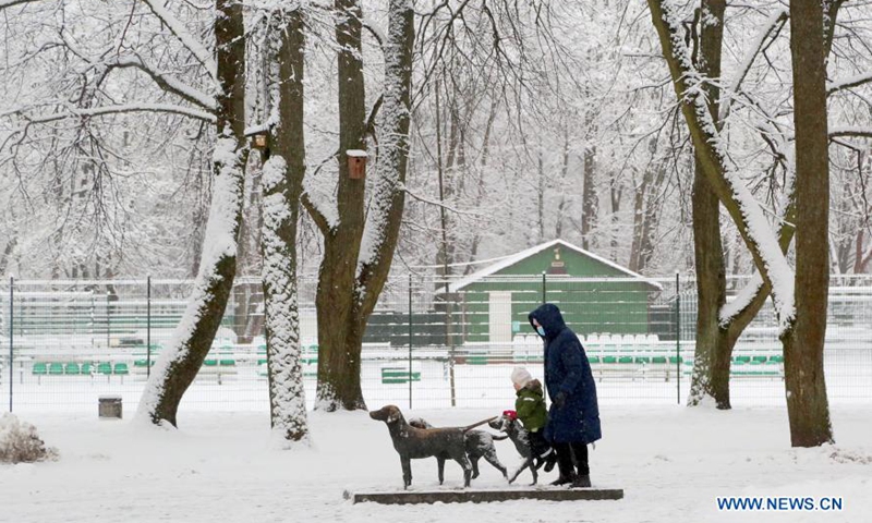 People have fun in the snow in Vilnius, Lithuania, Jan. 8, 2021. (Xinhua/Guo Mingfang)