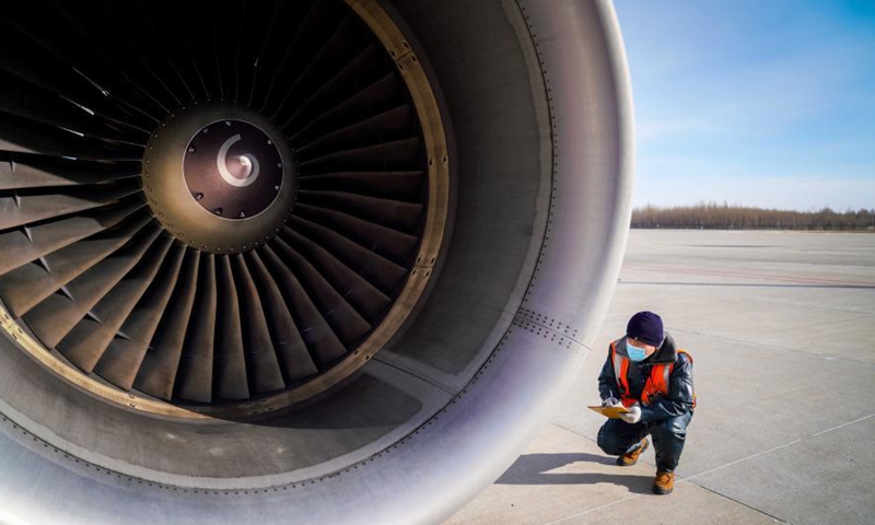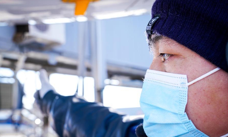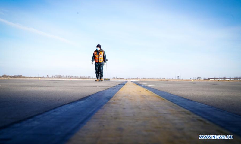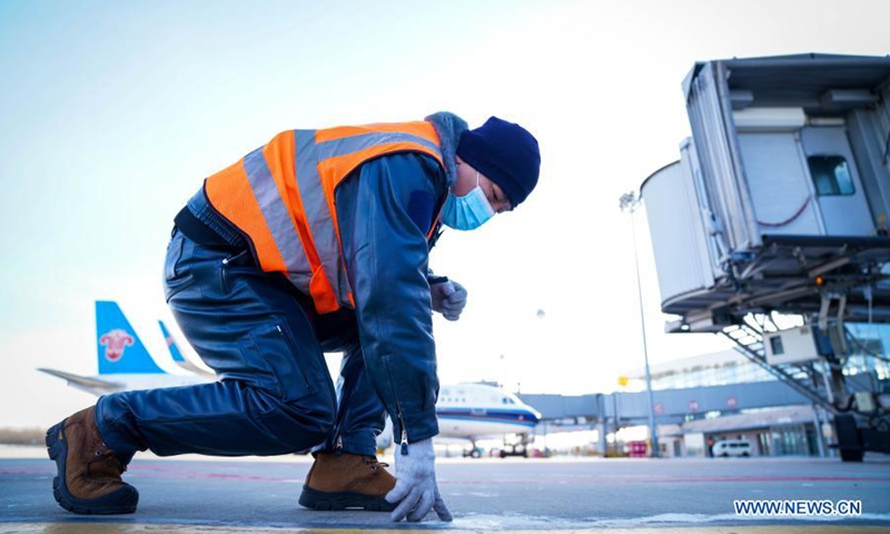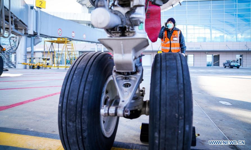 Guo Xin, leader of the aircraft maintenance team of Daqing Saertu Airport, works at the airport in Daqing, northeast China's Heilongjiang Province, Jan. 8, 2021. To ensure the smooth and safe operation of the airport, aircraft maintenance engineers here worked hard despite the low temperature of about minus 30 degrees Celsius. (Xinhua/Wang Song)