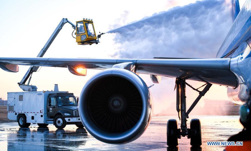 An aircraft maintenance engineer conducts anti-icing work for an aircraft at Daqing Saertu Airport in Daqing, northeast China's Heilongjiang Province, Dec. 29, 2020. To ensure the smooth and safe operation of the airport, aircraft maintenance engineers here worked hard despite the low temperature of about minus 30 degrees Celsius. (Xinhua/Wang Song)