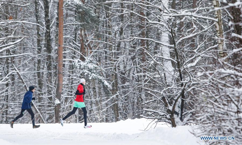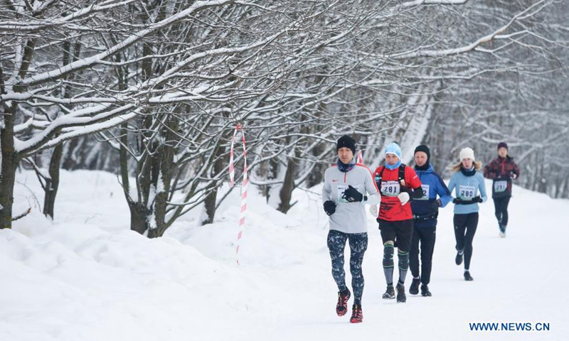 Runners compete during the "Run with the wind" running event in a park in Moscow, Russia, Jan. 9, 2021. (Photo by Alexander Zemlianichenko Jr/Xinhua)