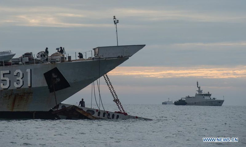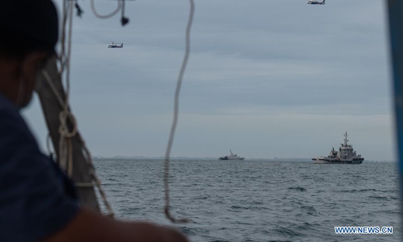 Navy ships conduct a search operation at the plane crash site of the Sriwijaya Air flight SJ-182 in the waters of Lancang Island, Jan. 10, 2021. Indonesia's Transportation Minister Budi Karya Sumadi has confirmed the crash of a Boeing 737-500 plane of an Indonesian airlines with 62 people on board that lost contact with the air traffic controller on Saturday afternoon. At a virtual press conference held on Saturday evening, the minister said the Sriwijaya Air flight SJ-182 heading from capital city Jakarta to Pontianak city in West Kalimantan province crashed into the waters off the Seribu District in north of Jakarta. According to him, the plane was believed to have crashed near the district's Laki Island and Lancang Island, part of the Thousand Islands chain. (Xinhua/Veri Sanovri)