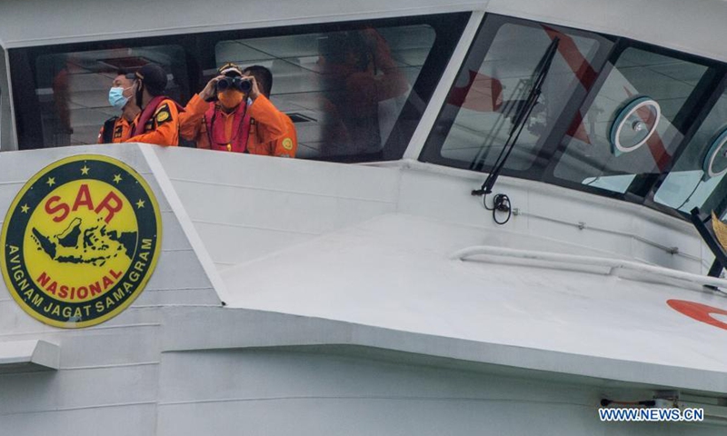 Members of Search and Rescue (SAR) team conduct a search operation at the plane crash site of the Sriwijaya Air flight SJ-182 in the waters of Lancang Island, Jan. 10, 2021. Indonesia's Transportation Minister Budi Karya Sumadi has confirmed the crash of a Boeing 737-500 plane of an Indonesian airlines with 62 people on board that lost contact with the air traffic controller on Saturday afternoon. At a virtual press conference held on Saturday evening, the minister said the Sriwijaya Air flight SJ-182 heading from capital city Jakarta to Pontianak city in West Kalimantan province crashed into the waters off the Seribu District in north of Jakarta. According to him, the plane was believed to have crashed near the district's Laki Island and Lancang Island, part of the Thousand Islands chain. (Xinhua/Veri Sanovri)
