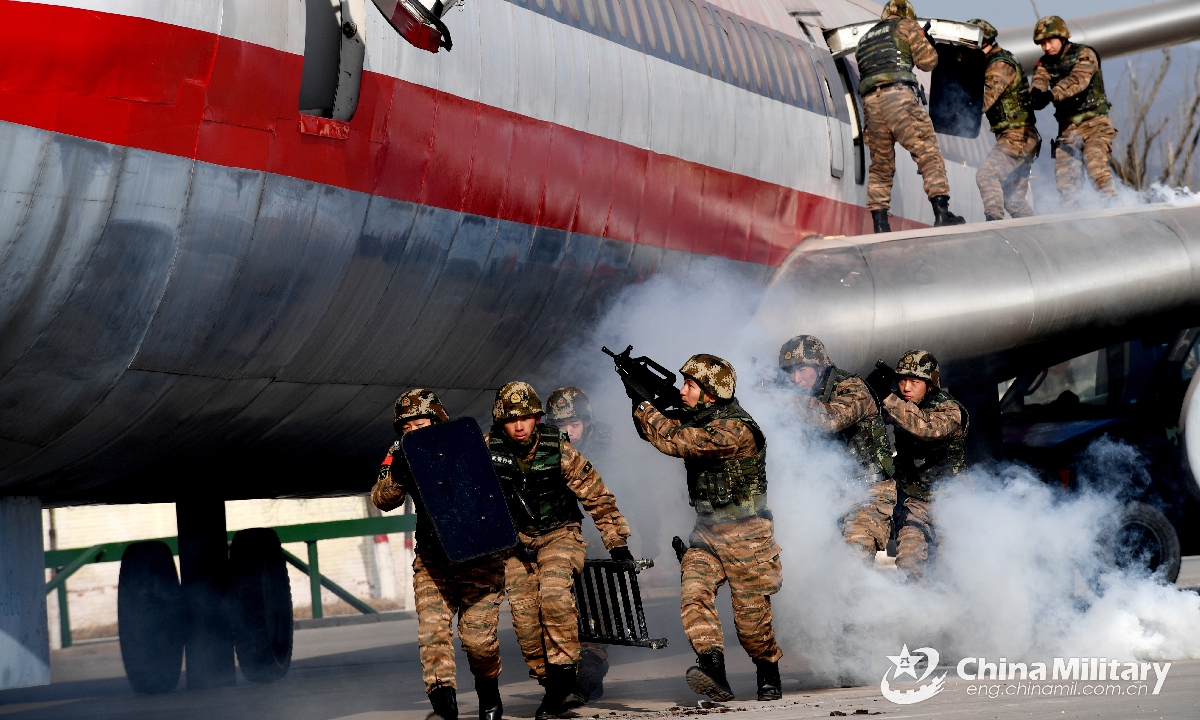 The special operation team assigned to a detachment of the Shanxi Armed Police Corps stages an anti-hijacking training exercise on Jan. 4, 2021. (eng.chinamil.com.cn/Photo by Luo Rong)