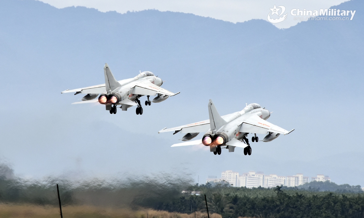 On Jan. 5, two fighter jets attached to a naval aviation brigade under the PLA Southern Theater Command take off during the first flight training in 2021. (eng.chinamil.com.cn/Photo by Lai Wei)