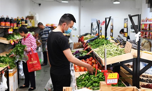 People buy vegetables at a store in Yubei District of southwest China's Chongqing Municipality on May 12, 2020. China's consumer price index (CPI) grew 3.3 percent year on year in April, moderating from the 4.3-percent gain in March, according to data from the National Bureau of Statistics (NBS). (Xinhua/Wang Quanchao)