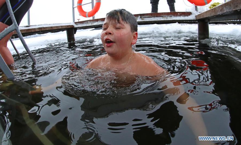 A boy takes part in a winter swimming event in Minsk, Belarus, Jan. 10, 2021. (Photo by Henadz Zhinkov/Xinhua)