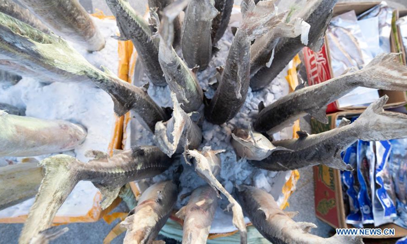 Photo shows frozen fish at a fish market in Fuyuan City, northeast China's Heilongjiang Province, Jan. 9, 2021. Fuyuan, the easternmost city of China, has abundant fishery resources. There is a century-old fish market in the city downtown where one can buy various fish products. (Xinhua/Zhang Tao)