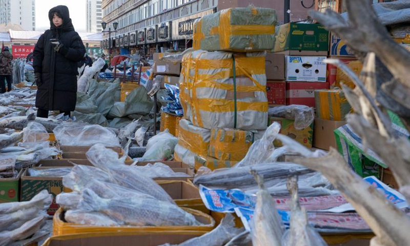 Photo shows packed frozen fish for delivery at a fish market in Fuyuan City, northeast China's Heilongjiang Province, Jan. 9, 2021. Fuyuan, the easternmost city of China, has abundant fishery resources. There is a century-old fish market in the city downtown where one can buy various fish products. (Xinhua/Zhang Tao)