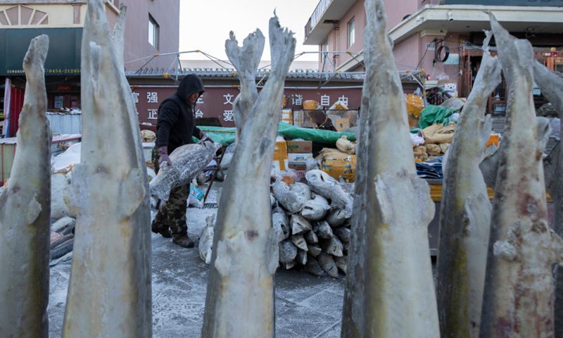 A merchant carries frozen fish at a fish market in Fuyuan City, northeast China's Heilongjiang Province, Jan. 9, 2021. Fuyuan, the easternmost city of China, has abundant fishery resources. There is a century-old fish market in the city downtown where one can buy various fish products. (Xinhua/Zhang Tao)