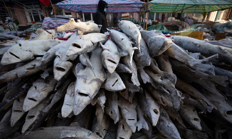 Photo shows piled up frozen fish at a fish market in Fuyuan City, northeast China's Heilongjiang Province, Jan. 9, 2021. Fuyuan, the easternmost city of China, has abundant fishery resources. There is a century-old fish market in the city downtown where one can buy various fish products. (Xinhua/Zhang Tao)