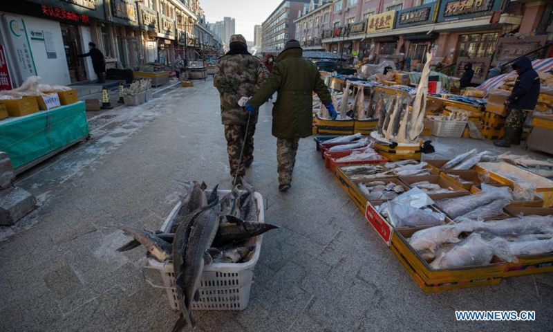 People carry fresh fish at a fish market in Fuyuan City, northeast China's Heilongjiang Province, Jan. 9, 2021. Fuyuan, the easternmost city of China, has abundant fishery resources. There is a century-old fish market in the city downtown where one can buy various fish products. (Xinhua/Zhang Tao)