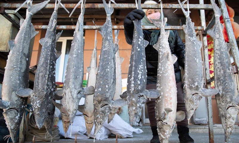 A merchant arranges frozen fish on a shelf at a fish market in Fuyuan City, northeast China's Heilongjiang Province, Jan. 9, 2021. Fuyuan, the easternmost city of China, has abundant fishery resources. There is a century-old fish market in the city downtown where one can buy various fish products. (Xinhua/Zhang Tao)