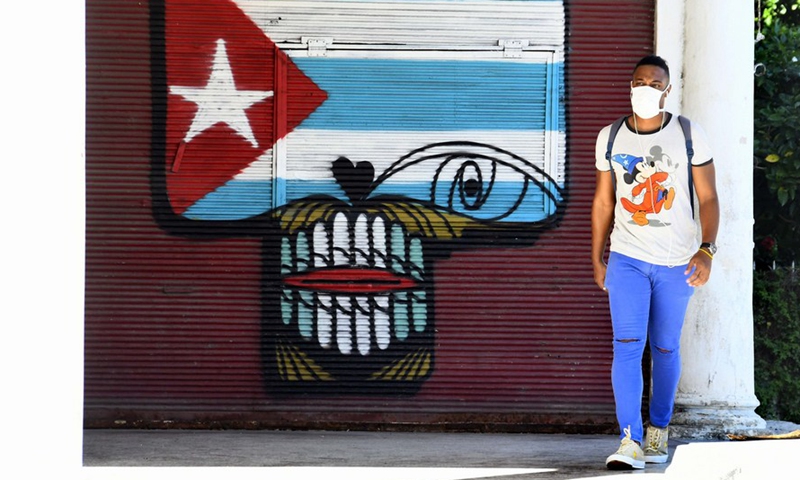 A man wearing a face mask walks on the street in Havana, Cuba, Aug. 10, 2020. (Photo by Joaquin Hernandez/Xinhua)