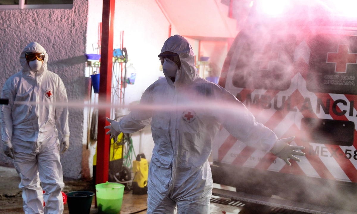 A paramedic of the Mexican Red Cross is sanitized after having transferred a COVID-19 positive patient to an emergency room in Toluca, Mexico, on Sunday. Faced with the saturation of hospitals due to the pandemic, which has left more than 1.5 million infections and 132,000 deaths, the Mexican Red Cross is coordinating with health centers and emergency services to find available beds in the area. Photo: AFP