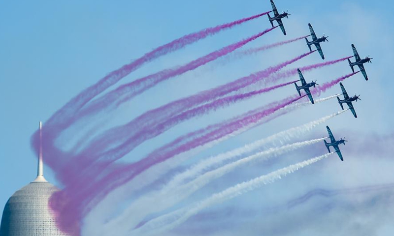 An aerobatic team performs during a military parade to mark Qatar's National Day celebration in Doha, capital of Qatar, on Dec. 18, 2020. (Photo by Nikku/Xinhua)