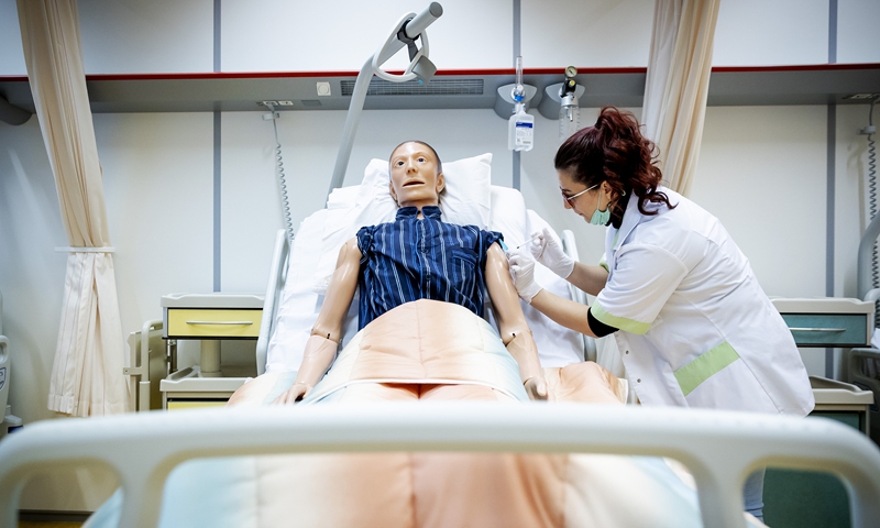 A Dutch student learns how to vaccinate patients against COVID-19 on Monday in The Hague, as the country has started its national vaccination campaign. The trained students will be soon sent to different locations, like retirement homes and care houses, to help in the inoculation. Photo: AFP