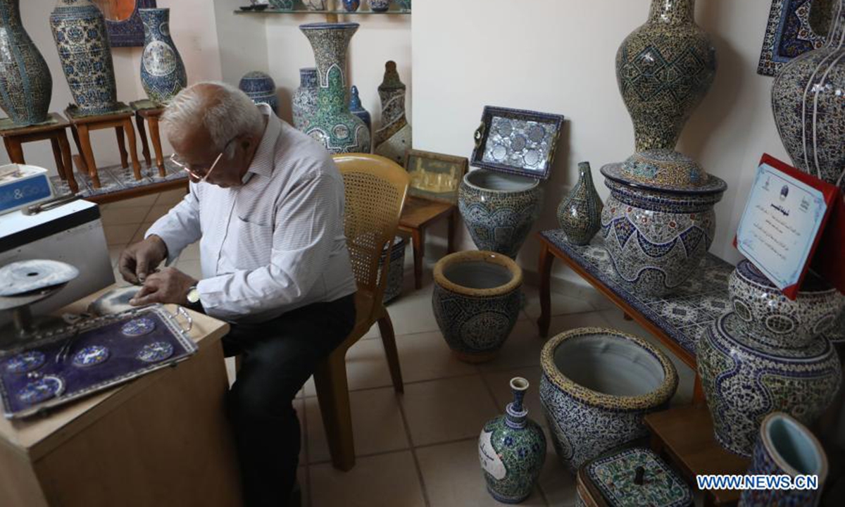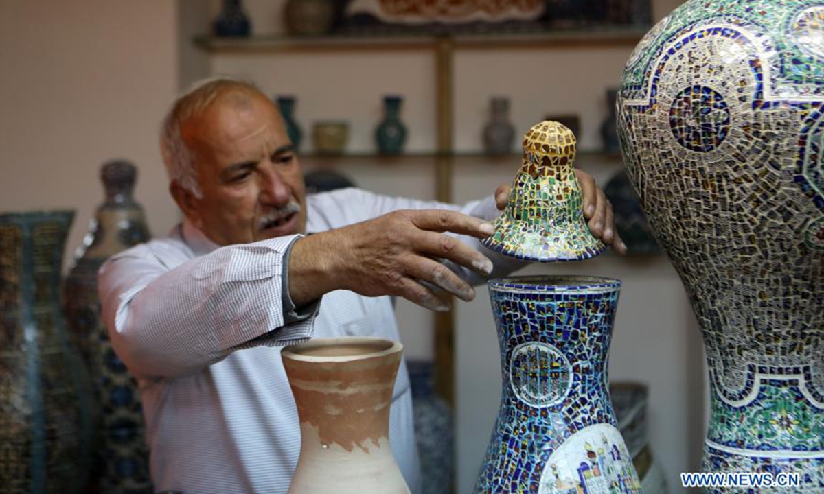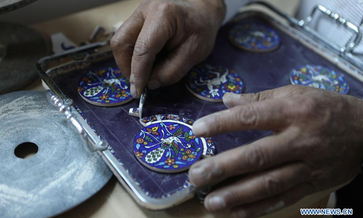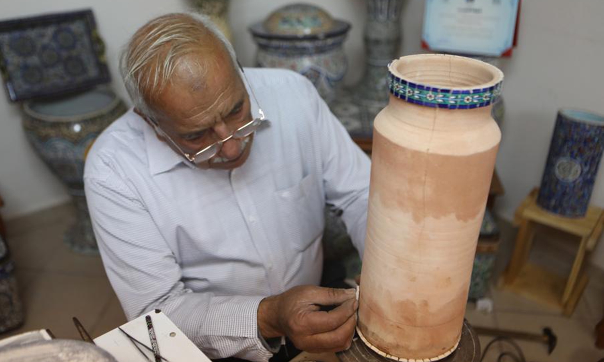 Palestinian artist Mohammad Al-Jabari works on a ceramic artwork in his house in the West Bank city of Hebron, Jan. 9, 2021. Al-Jabari, 71, spent the past 30 years collecting damaged ceramics and cutting them into small pieces to create artworks and make a living. (Photo by Mamoun Wazwaz/Xinhua)