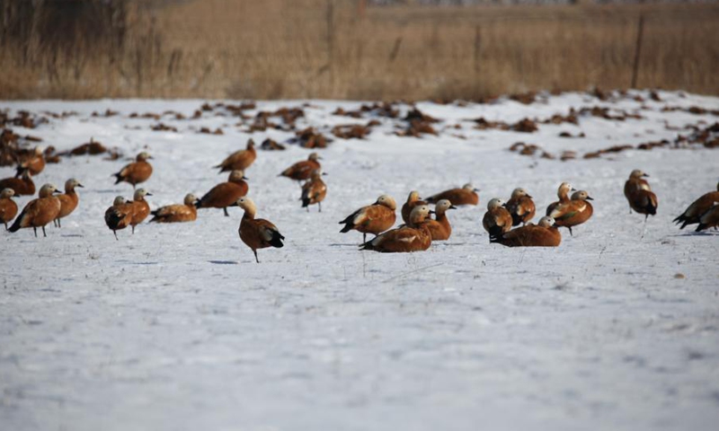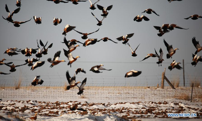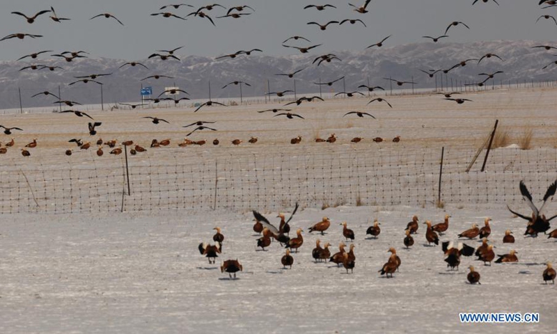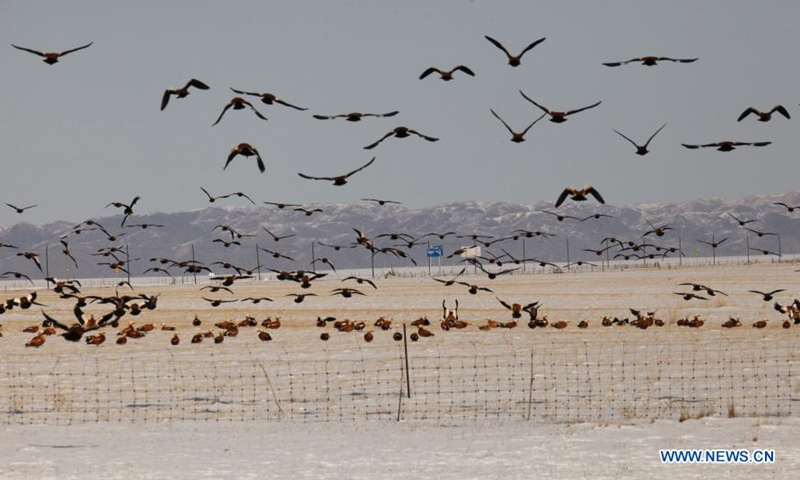Photo taken on Jan. 10, 2021 shows swarms of swan geese roosting and foraging in Wulate Middle Banner, north China's Inner Mongolia Autonomous Region. Flocks of migratory birds such as swan geese and ruddy shelduck have come to the grasslands of Uiad, north China's Inner Mongolia Autonomous Region, to spend the winter. (Xinhua/Li Yunping)