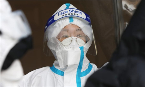 A staff member works at a nucleic acid testing site in Heping District, Shenyang, northeast China's Liaoning Province, ...