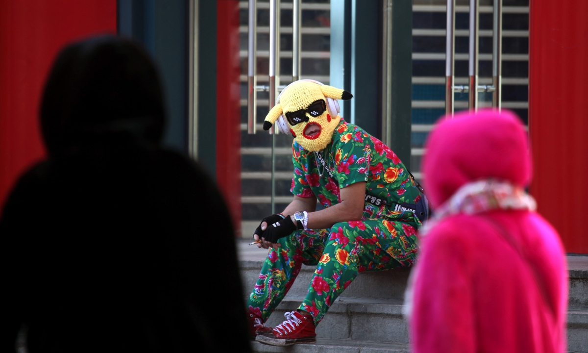 A man in Shenyang, Northeast China's Liaoning Province, is seen wearing Pikachu headgear and a pair of white earphones and dressed in elaborate red-and-green outfit, in stark contrast to the white-grey winter streets. Photo: IC
