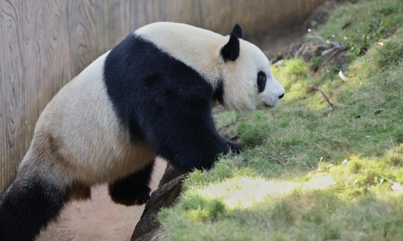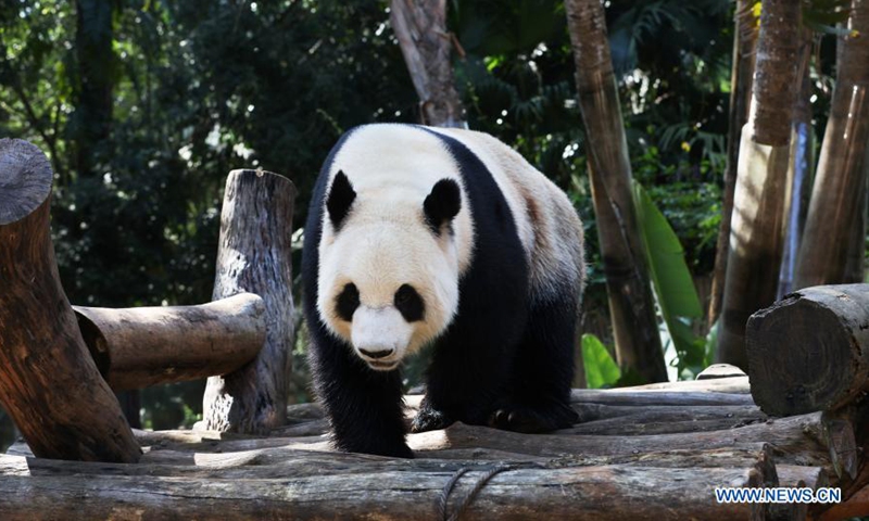 Giant panda Gong Gong plays at the Hainan Tropical Wildlife Park and Botanical Garden in Haikou, south China's Hainan Province, Jan. 12, 2021. Giant pandas Gong Gong and Shun Shun are now aged seven. (Xinhua/Zhang Liyun)