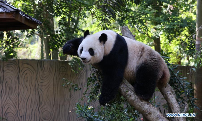 Giant panda Gong Gong rests on the tree at the Hainan Tropical Wildlife Park and Botanical Garden in Haikou, south China's Hainan Province, Jan. 12, 2021. Giant pandas Gong Gong and Shun Shun are now aged seven. (Xinhua/Zhang Liyun)