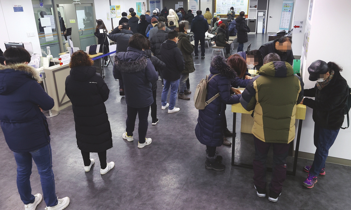 Unemployed people line up in a long queue in a social welfare center waiting to receive unemployment benefits in Seoul, South Korea on Wednesday. South Korea's unemployment rate surged to an 11-year high in December 2020, while the number of employed fell at the fastest pace in nearly 22 years. Photo: VCG