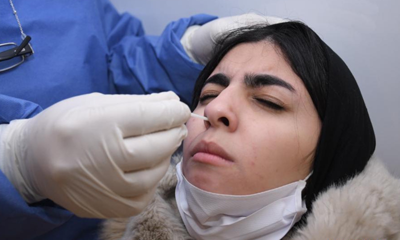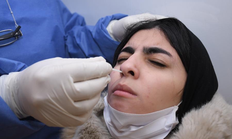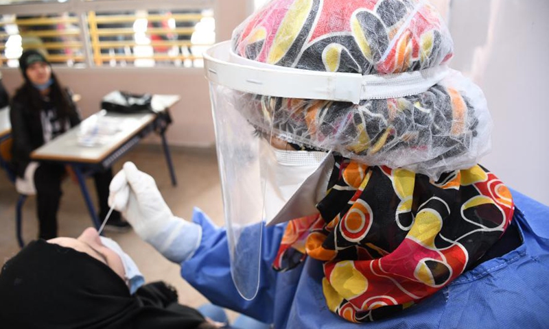 A medical worker takes a swab sample from a student for a COVID-19 test in Rabat, Morocco, Jan. 12, 2021. Morocco on Tuesday reported 801 new COVID-19 cases, taking the tally of infections in the country since March 2 to 453,789. A campaign to detect the new variants of COVID-19 has been organized in middle and high schools across six regions in the country. (Photo by Chadi/Xinhua)