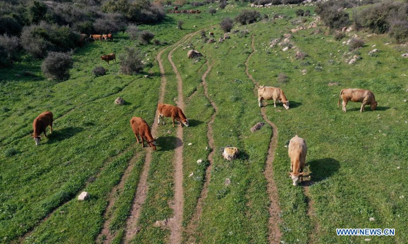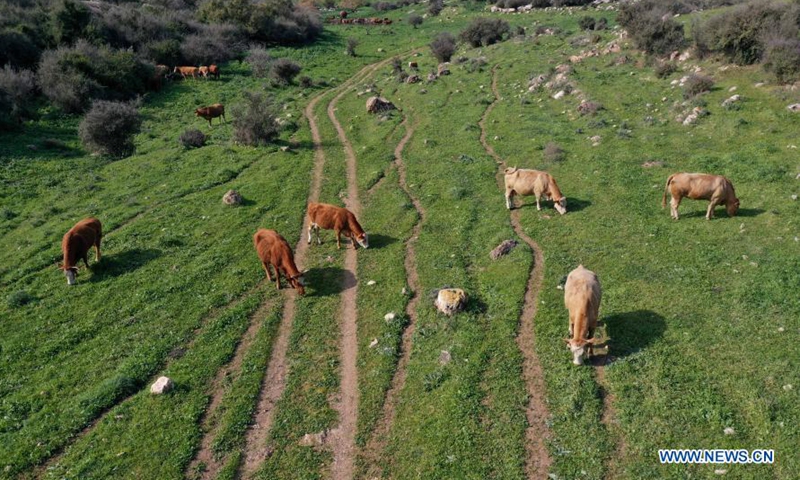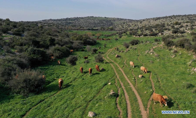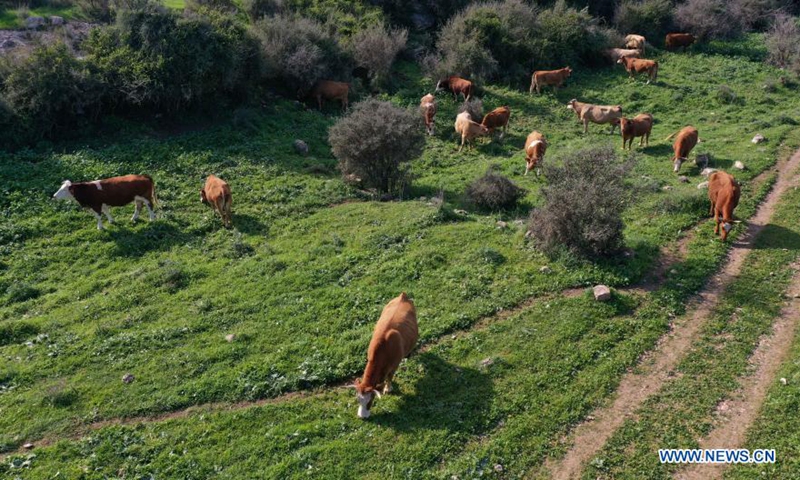 Aerial photo taken on Jan. 12, 2021 shows a herd of cattle in the field at Ayalon Valley near Latrun. (Photo by Gil Cohen Magen/Xinhua)