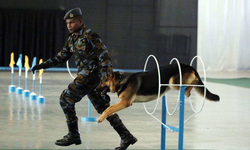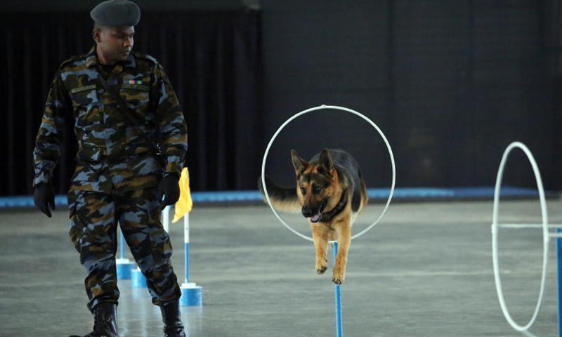 A sniffer dog led by its trainer performs hoop-hopping at the Sri Lanka Air Force (SLAF) Base in Katunayake, Sri Lanka, Jan. 13, 2021. A group of 20 dogs under the SLAF Dog Unit attended the pass ceremony on Wednesday. They were specially trained as sniffer dogs for detecting of drug trafficking, and would be deployed at airports in the country. (Photo by Ajith Perera/Xinhua)