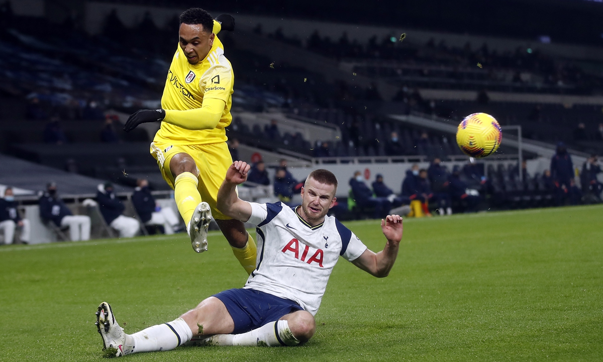 Fulham's Kenny Tete crosses the ball under pressure from Tottenham Hotspur's Eric Dier at the Tottenham Hotspur Stadium in London, England on Wednesday. Photo: VCG